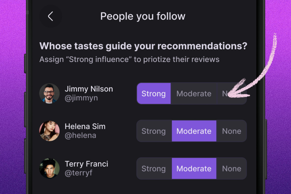 Fine-tune your recommendations by adjusting influence levels for the people you follow and the review sites we include.