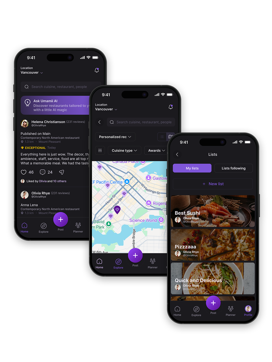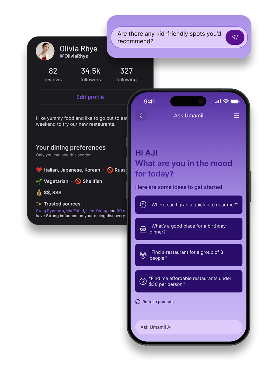 Between review sites, top lists, social media, and texting friends, choosing a restaurant can feel overwhelming. Umamii cuts through the clutter with trusted voices and recommendations tailored to your tastes, so deciding feels easy again and fast.